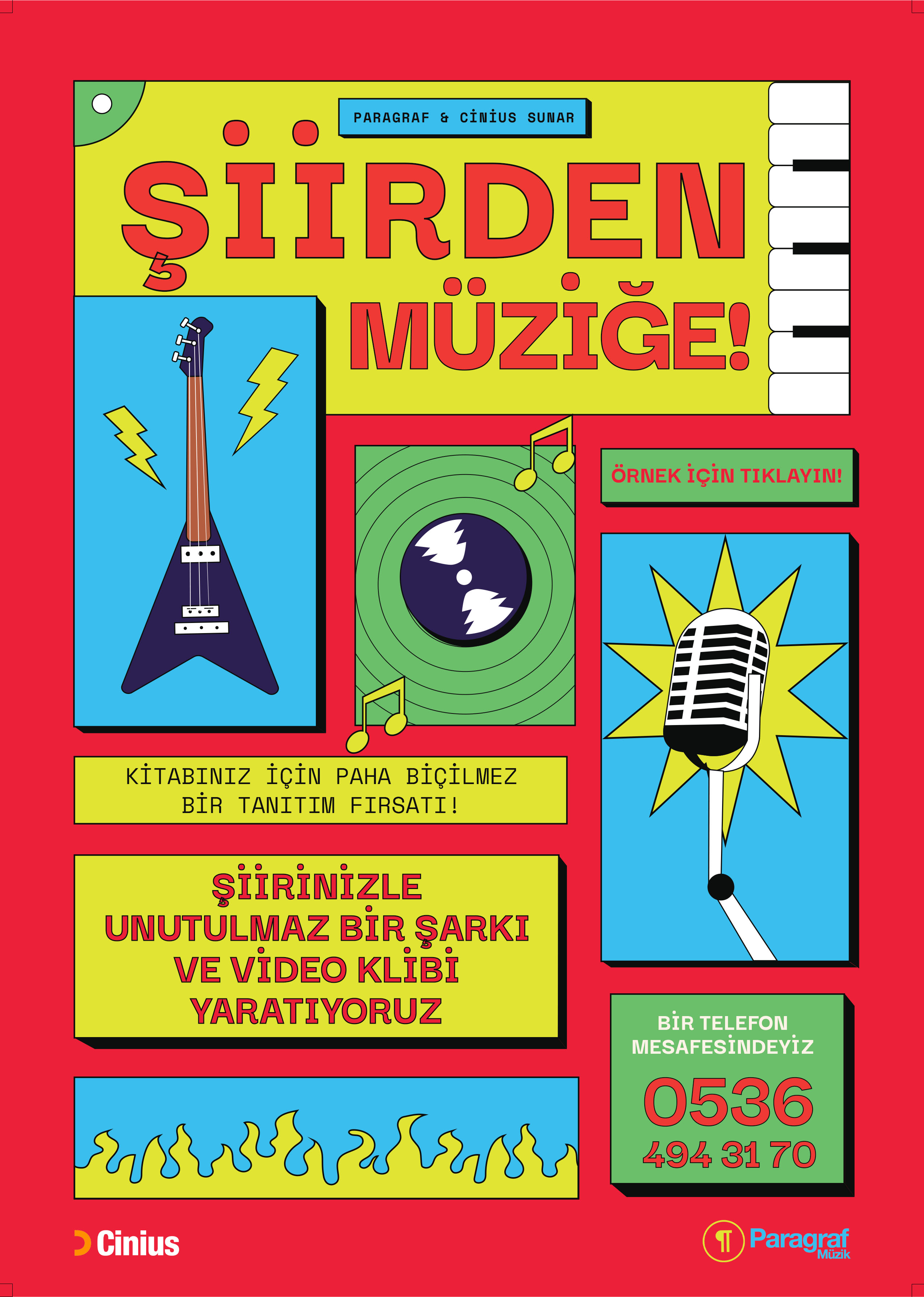 Paragraf Ajans Türk şairlerine yepyeni bir kapı aralıyor. Kitabınızın görünürlüğünü ve dolayısıyla satışlarını da artırmak için dilediğiniz şiirinizi kısa sürede kulak kamaştıran bir şarkıya dönüştürüyor, ona eşlik edecek bir video klibi hazırlıyor ve sosyal medya platformlarında yayınlıyoruz. Türk Sanat Müziği'nden caz ya da Anadolu Rock'a kadar her türde, şiirinizin ruhuna uygun bir müzik ve bir klip yaratıyoruz ve onu sosyal medyada yayıyoruz. Dilerseniz de 8 ya da 10 tane şiirinizden bir albüm yaratıyor ve Spotify, Apple Music vb. müzik platformlarında albüm olarak yayınlıyoruz.
